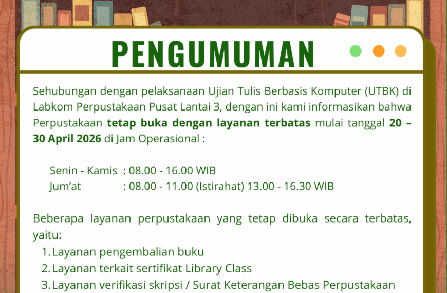 Temukan informasi terkini terkait layanan perpustakaan, perubahan jam layanan, berita serta informasi penting lainnya yang berkaitan dengan kegiatan akademik dan pengembangan koleksi.