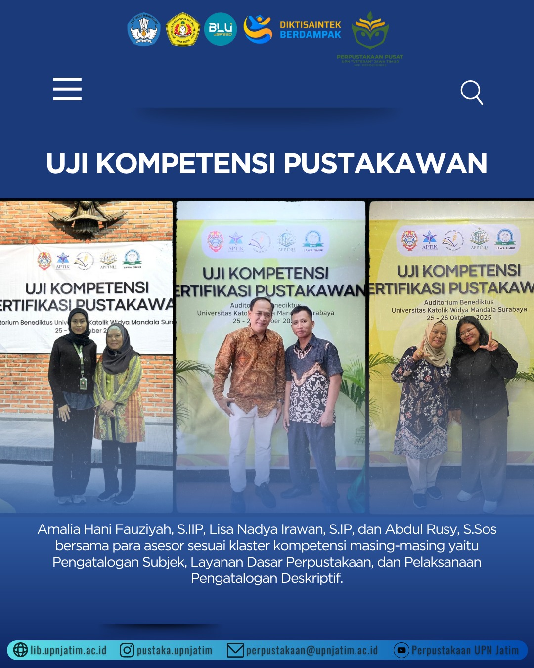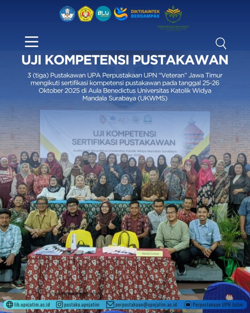 Sertifikasi ini merupakan bagian dari upaya peningkatan mutu layanan perpustakaan dan pengembangan karier pustakawan agar memiliki sertifikat kompetensi yang diakui secara nasional oleh Lembaga Sertifikasi Profesi (LSP) Pustakawan. 3 (tiga) orang pustakawan UPA Perpustakaan UPN Veteran Jawa Timur yaitu; Lisa Nadya Irawan, Amalia Hani Fauziyah dan Abdul Rusy mengikuti sertifikasi kompetensi pustakawan pada tanggal 25-26 Oktober 2025 di Aula Benedictus Universitas Katolik Widya Mandala Surabaya dengan klaster kompetensi yang berbeda sesuai dengan pekerjaan yang dilakukan di perpustakaan.